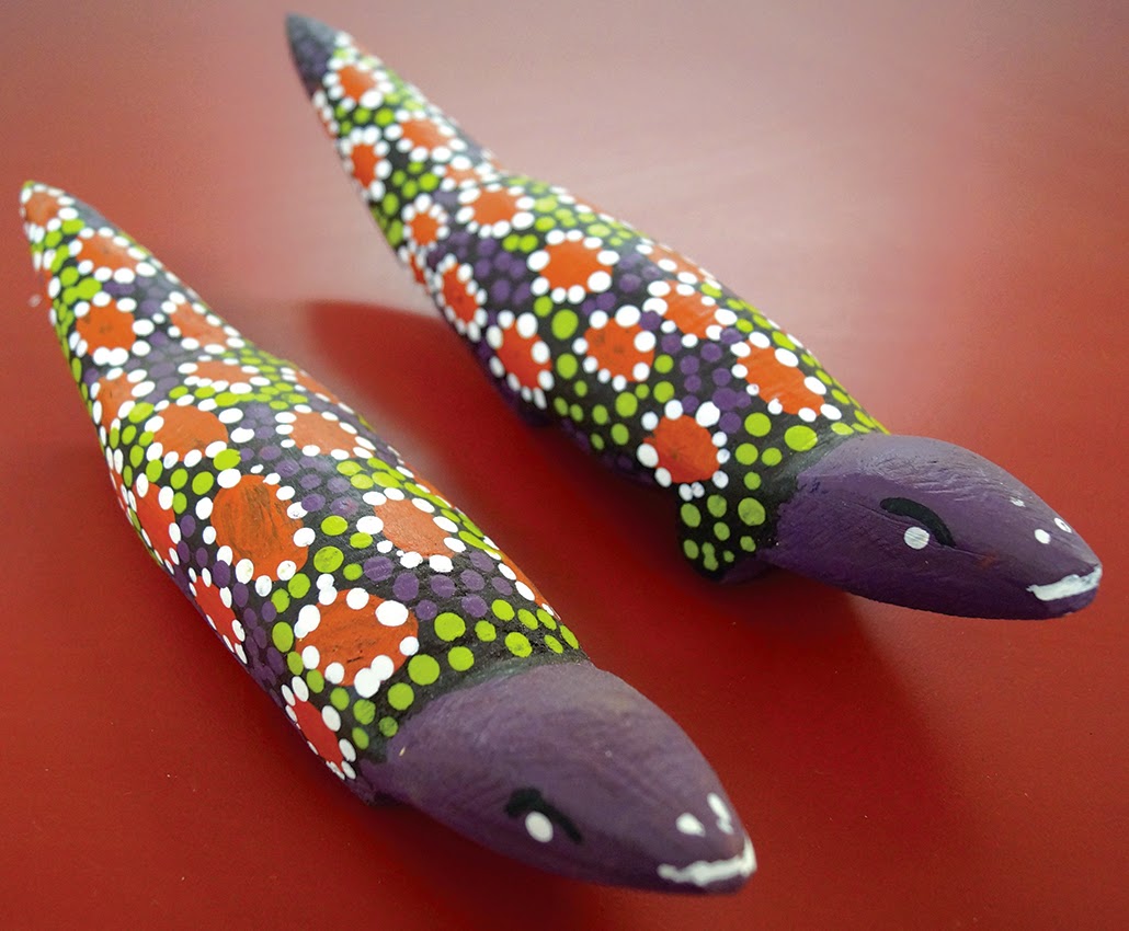 After viewing Aboriginal paintings and carvings, students used a tiny brush and a matchstick to apply a pattern of stripes and dots in colours of their choice. Small googly eyes were glued on to complete and immediately these lizards had quirky personalities of their own!